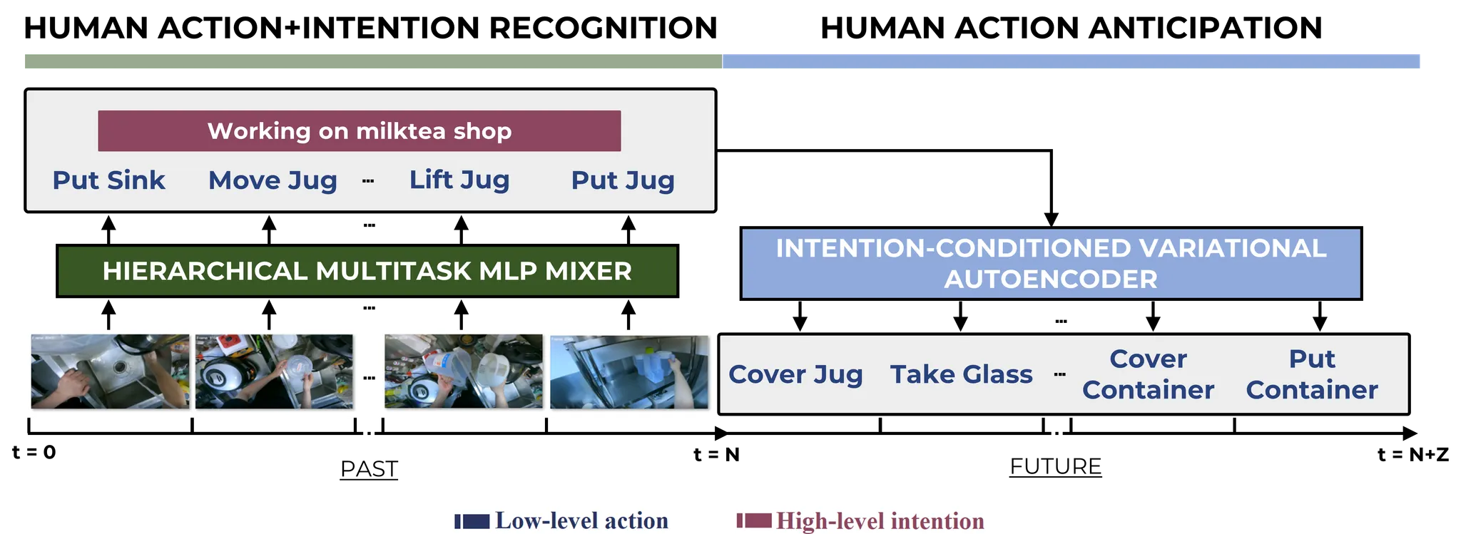To anticipate how a person would act in the future, it is essential to understand the human intention since it guides the subject towards a certain action. In this paper, we propose a hierarchical architecture which assumes a sequence of human action (low-level) can be driven from the human intention (high-level). Based on this, we deal with long-term action anticipation task in egocentric videos. Our framework first extracts this low- and high-level human information over the observed human actions in a video through a Hierarchical Multi-task Multi-Layer Perceptrons Mixer (H3M). Then, we constrain the uncertainty of the future through an Intention-Conditioned Variational Auto-Encoder (I-CVAE) that generates multiple stable predictions of the next actions that the observed human might perform. By leveraging human intention as high-level information, we claim that our model is able to anticipate more time-consistent actions in the long-term, thus improving the results over the baseline in Ego4D dataset. This work results in the state-of-the-art for Long-Term Anticipation (LTA) task in Ego4D by providing more plausible anticipated sequences, improving the anticipation scores of nouns and actions. Our work ranked first in both CVPR@2022 and ECCV@2022 Ego4D LTA Challenge.